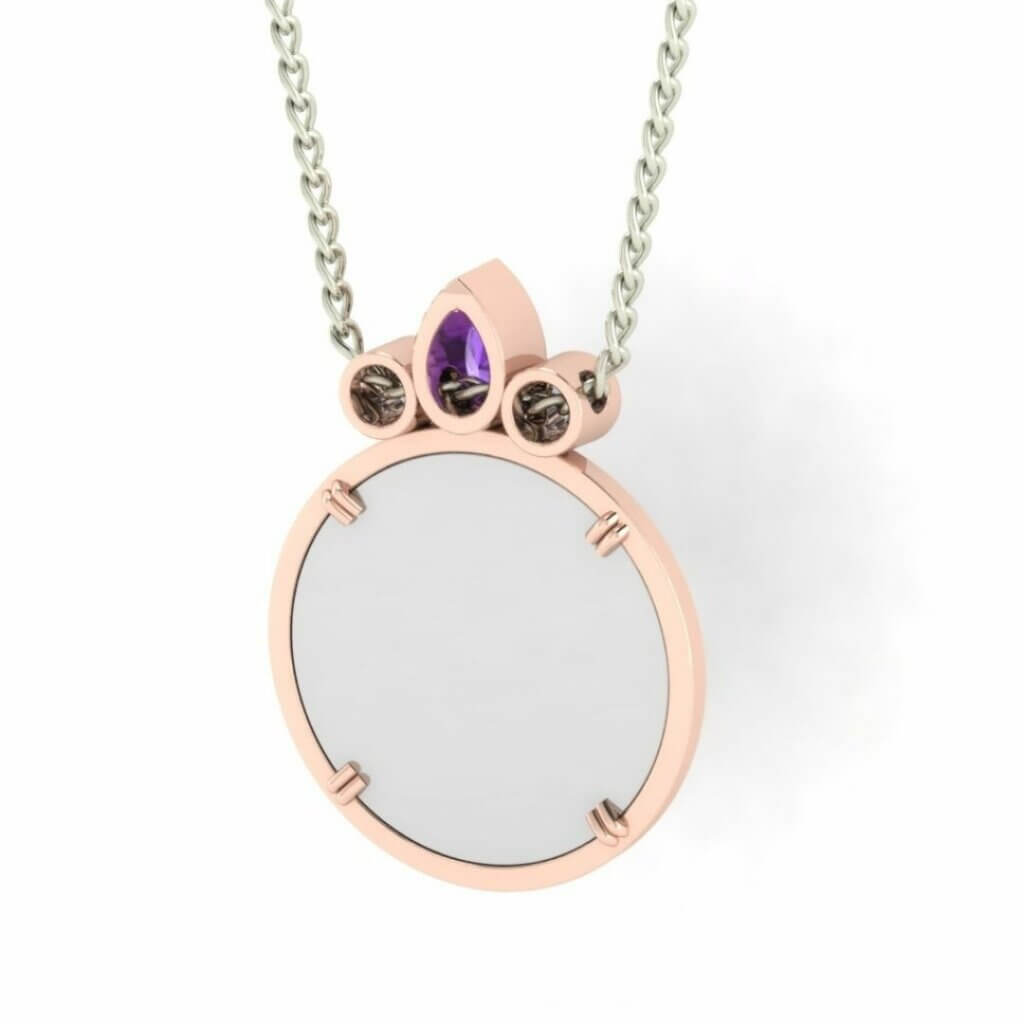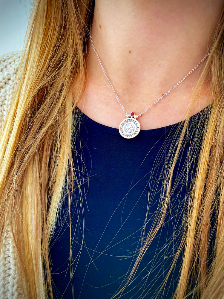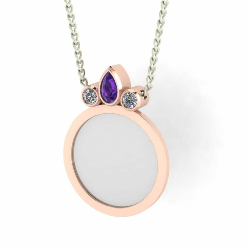 He had a carved coin, which he found out was a Victorian love token – perfect as the starting point for Ellis’ birthday gift as her birthday was on Valentines Day! We set it in the style of a sovereign pendant, with a rose gold bezel for contrast. A pear cut amethyst (February’s birthstone) and a pair of brilliant cut diamonds are bezel set in white gold on top of the pendant like a crown. The chain runs through the settings for a clean, contemporary look.