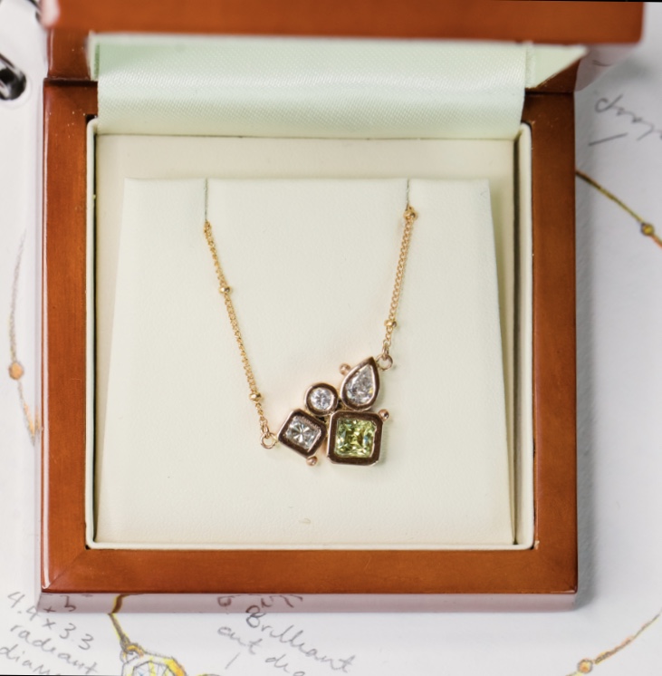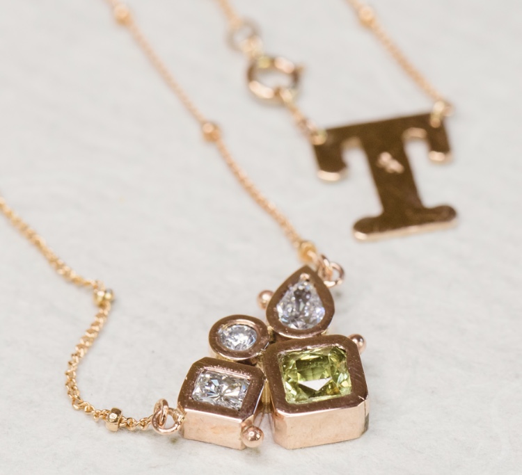 Tracy’s special birthday trip to China was cancelled during the pandemic, and so she decided to go for a bespoke pendant instead! She wanted to cluster some of her favourite cuts of diamonds along with a yellow sapphire in rose gold, suspended on a satellite chain. We added a T shaped charm that her mother had given her many years ago to the back of the chain.