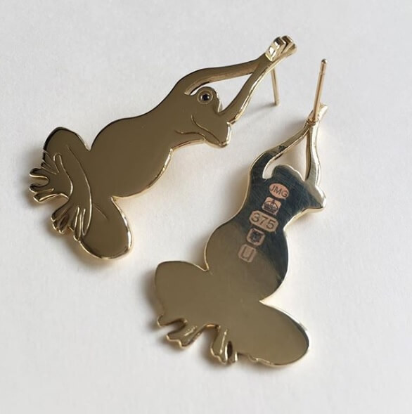 A pair of bespoke earrings with my hallmark laser etched into the reverse. These are 9ct yellow gold, and so carry the number 375
