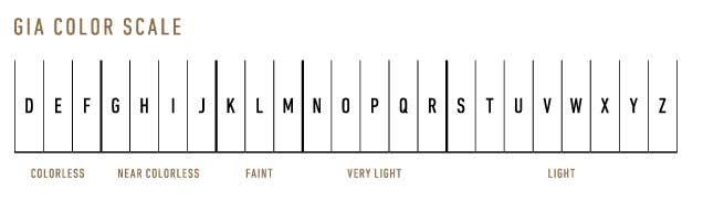 Most jewellers use the GIA colour scale that uses an alphabetical scale from D to Z when discussing the whiteness or absence of colour in white diamonds. D represents truly colourless and white diamonds, which are very rare and the most desirable and so attract the highest price tags. As you travel through the scale closer to Z, you’ll find a greater presence of colour (yellow or brown).