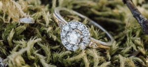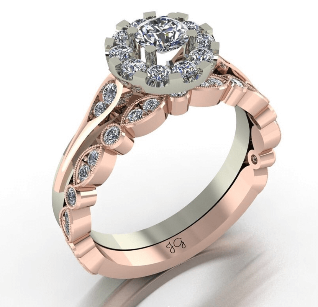 Ryan came to me to design Caity’s bespoke engagement ring last year. As he’s based in Canada, we did all the designing via email and Skype. He had a good idea of what she liked so was confident to design it as a surprise. The end result was this stunning platinum, and 18ct rose gold ring with a diamond cluster setting, as photographed by their photographer during their engagement shoot.