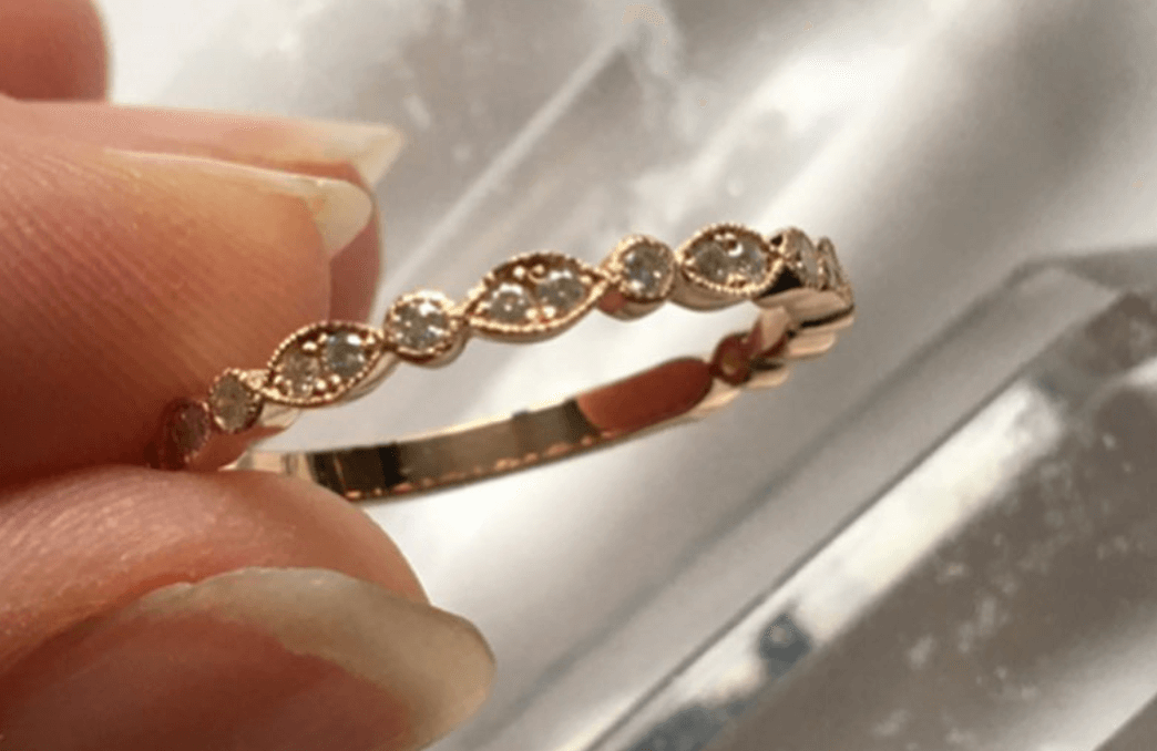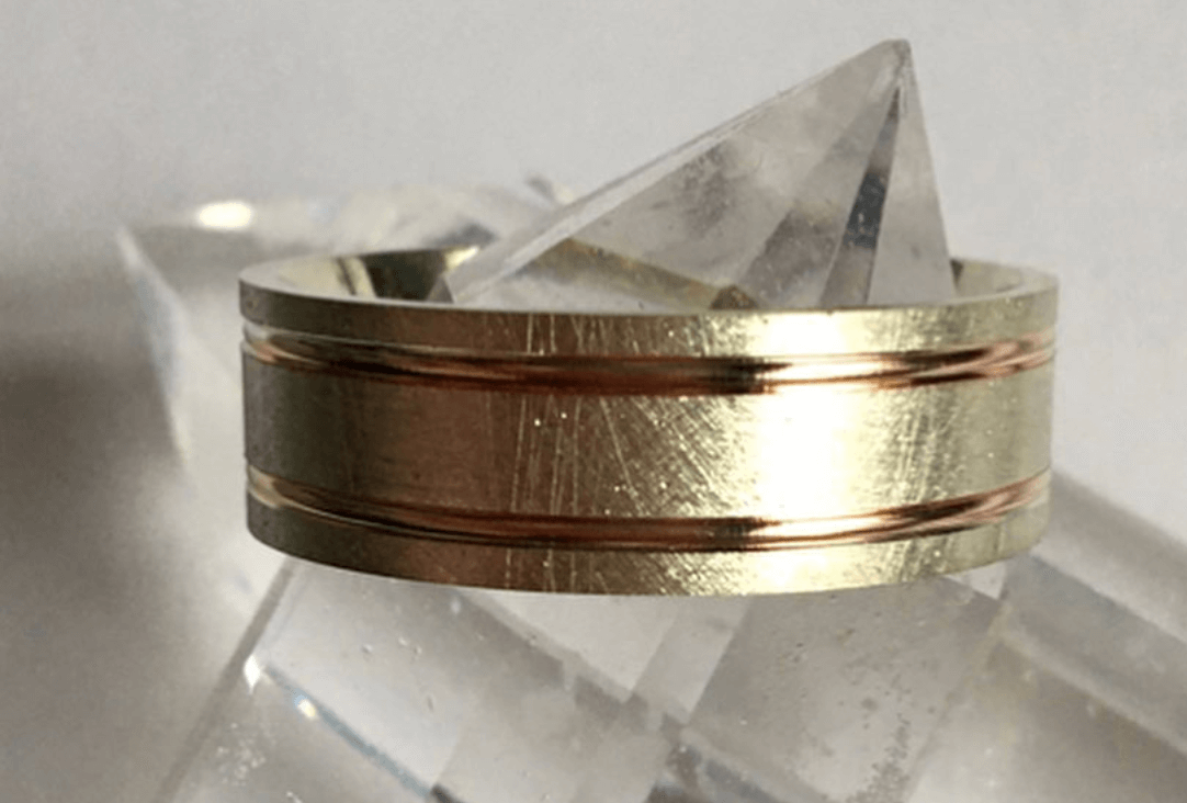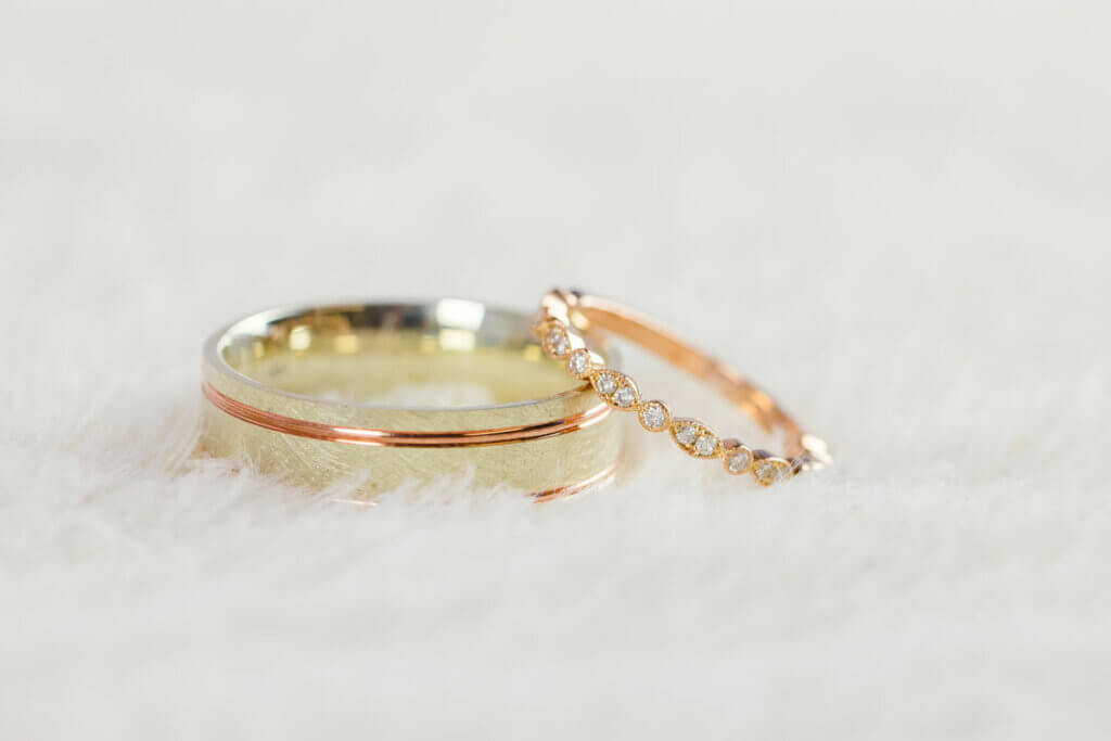 Ryan wanted his ring to complement the colours of Caity’s rings, so went for a combination of white and rose gold. One of my favourite features of his ring is the scratchy brushed finish that gives a unique style to his ring. It gives it a masculine feel and gives his ring a unique quality. He wasn’t worried about matching the platinum of Caity’s engagement ring so kept costs down by opting for 9ct white gold. He also chose white gold because he likes the warmer tone of it compared to platinum. I really respect that he decided to leave the white gold natural and un-plated. This means it is the natural colour without the rhodium plating that High Street jewellers apply by standard to all white gold (you can read more about rhodium plating here). Rhodium wears with time and needs re-plating, so not only does Ryan’s ring look great, it requires no maintenance. The warm tones of the two colours of gold look great and will suit Ryan’s skin tone really well.