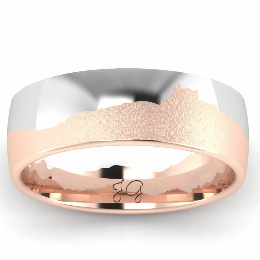 The rose gold half of the ring is in this silhouette, with a brushed finish to capture the earthy, rugged landscape. We made sure to include the silhouette of Auchindoun castle, which is very special to the couple. The sky itself is depicted in natural, unplated, polished white gold to contrast the rose gold landscape.